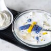 Black sticky rice serve with taro, young coconut meat topped with coconut cream
