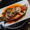Deed fried whole barramundi with assorted herbs, ginger, lemongrass, green apple, green mango (seasonal), mint. Lime leaves, chilli and peanuts, dressed with chilli jam lime dressing