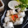 Slice of roasted duck with cucumber, leek and hoisin sauce wrapped in Peking duck pastry