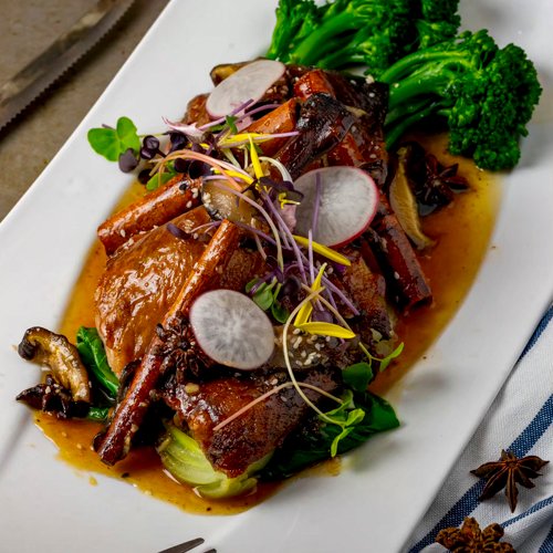 Roasted duck with blended plum sauce, topped with tantalizing garlic, cinnamon stick, star anise, served with shiitake mushrooms, broccolini, and bok choy stir-fried